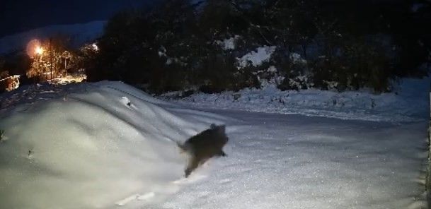Elazığ’da kar yağışı sonrası doğada yiyecek bulmakta güçlük çeken domuzlar, Sivrice ilçesi Kürk köyüne indi. Köyün içerisinde bulunan güvenlik kamerasına yansıyan domuz sürüsü bir süre sonra ormanlık alana kaçarak uzaklaştı. O anlar güvenlik kamerası tarafından saniye saniye kaydedildi.