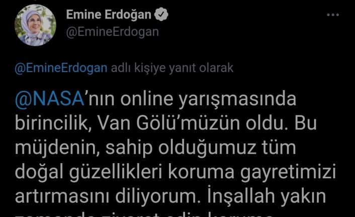 Daha önce finalist Van Gölü fotoğrafı için destek çağrısında bulunan Cumhurbaşkanı Erdoğan’ın eşi Emine Erdoğan, bu kez Twitter hesabından ikinci bir paylaşım daha yaptı. Erdoğan, "NASA’nın online yarışmasında birincilik, Van Gölü’müzün oldu. Bu müjdenin, sahip olduğumuz tüm doğal güzellikleri koruma gayretimizi artırmasını diliyorum. İnşallah yakın zamanda ziyaret edip koruma çalışmalarını yerinde görmeyi arzu ediyorum. #DünyaOrtakEvimiz" ifadelerini kullandı.