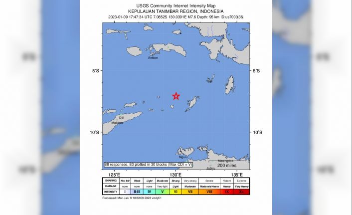 ABD Jeolojik Araştırma Merkezi (USGS) tarafından yapılan açıklamada, Endonezya’ya bağlı Tanimbar Adaları’nın bulunduğu bölgede 7.6 büyüklüğünde deprem meydana geldiği bildirildi. USGS, depremin 95 kilometre derinlikte yaşandığını açıkladı.