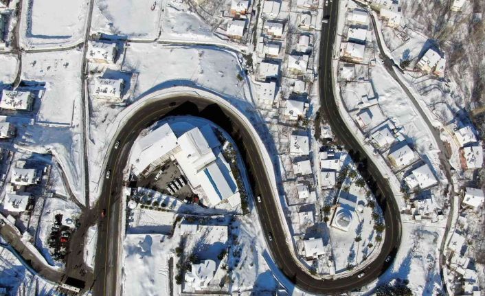 Beyaza bürünen Erciyes’te havadan çekilen görüntüler kartpostallık görüntüler ortaya çıkarırken, Erciyes’e giden kıvrım kıvrım yolları da adeta yılanı andırdı.
