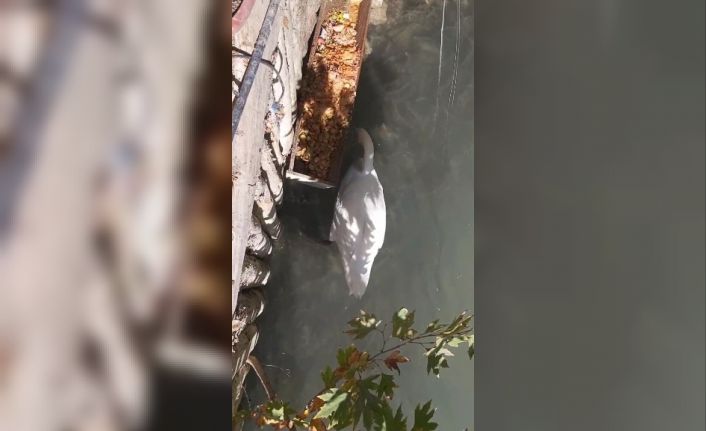 Görüntülerde kuğunun yemliğindeki yemleri gagasıyla alarak suda bulunan balıklara verdiği görülüyor.