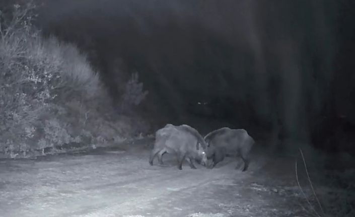 Tekirdağ’da Ganos Dağları’nda fotokapan kamerasına yansıyan görüntülerde, aynı anda kameranın iki farklı noktasında kavga eden domuzlar ilginç anlara sahne oldu.