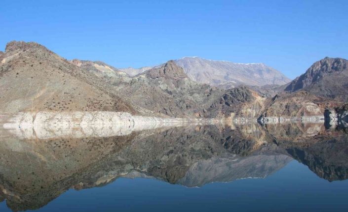 Erzurum’un Oltu ilçesindeki Ayvalı Barajı’nda berrak suya dağların yansıması kartpostallık görüntüler oluşturdu.