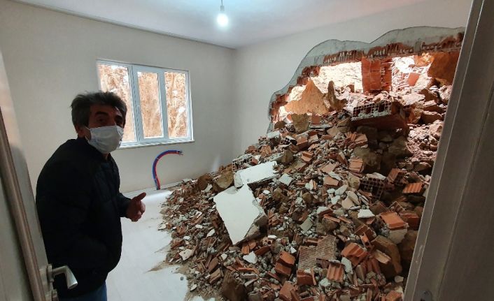 İnönü Mahallesi Şehit Zikri Şahin Sokak’ta bulunan 2 katlı binanın hemen arkasındaki kaya kütleleri sabaha karşı büyük bir gürültüyle koparak evin içine girdi.