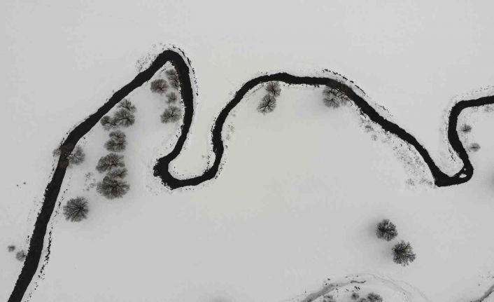 Yılın büyük bölümünde karla kaplı olan ilçenin Güzeldere Ovası’ndaki menderesler, her mevsim etkileyici manzaralar oluştururken bugünlerde dondurucu soğuğun etkisiyle buz tuttu. Yaz aylarında yeşilin tüm tonlarıyla renklenen menderesler, kışın da bembeyaz kar örtüsü ve sis bulutları arasından süzülen görüntüsüyle görenleri kendine hayran bıraktı. Kar yağışıyla birlikte kıvrak şekilde uzayıp Güzeldere Vadisi’nden geçen mendereslerin kilometrelerce uzanan kıvrımlı yapısının oluşturduğu manzara drone ile görüntülendi. Öte yandan kartpostallık görüntüler oluşturan mendereslerde yabani hayvanların yer alması, seyrine doyumsuz görüntüler oluşturdu.