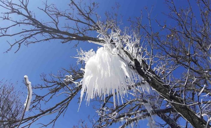 Bolu’da hava sıcaklığının sıfırın altına düşmesiyle ağaç dalları buz tuttu. Oluşan görüntü, görenleri mest etti.