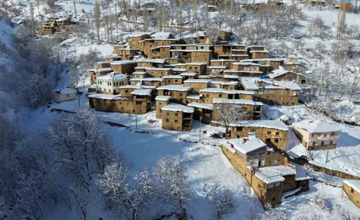 Bitlis’in Hizan ilçesindeki taş evlerden oluşan köyler, kar yağışıyla birlikte kartpostallık manzaralar oluşturuyor.