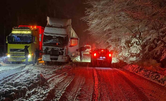 Artvin’in Borçka ilçesinde yoğun kar yağışı nedeniyle yolda kalan araçlar, Borçka-Hopa karayolunun trafiğe kapanmasına neden oldu. Karayolunda uzun araç kuyrukları oluştu.