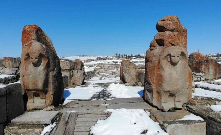 Ziyaretçilerini tarihte yolculuğa çıkartan ve her mevsim ayrı güzellik sunan Çorum’un Alaca ilçesine bağlı Alacahöyük köyünde bulunan Alacahöyük Örenyeri, kar yağışının ardından ayrı bir güzelliğe büründü. Karla kaplı antik kentte kartpostallık manzaralar oluştu. Mest eden güzelliklerin oryaya çıktığı Alacahöyük, dronla görüntülendi.