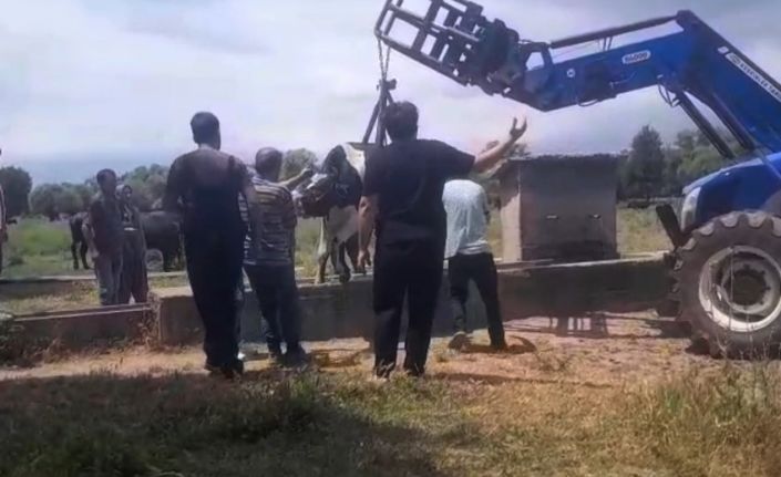 Bolu’da Yazören köyünde merada otlayan bir inek, su içmek için yaklaştığı oluğun içine girerek sıkıştı. Köylüler ineği kurtarmak için seferber oldu.