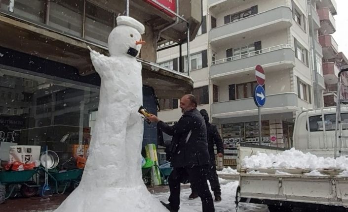 Sakarya’nın Karasu ilçesinde kar yağışını fırsat bilen bir grup esnaf bir araya gelerek, yaklaşık 3 metre boyunda kardan adam yaptı.