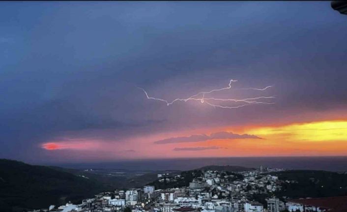 Hatay’da gün batımında İskenderun Körfezi üzerinde çakan şimşekler adeta görsel şölen oluşturdu. İskenderun Körfezi’nde akşam şimşeklerle gelen sağanak yağmur havayı serinletirken, Körfez’de yağmur etkili oldu. Gün batımında etkisini arttıran şimşekler körfezde görsel bir şölen oluşturdu. Şimşekler gece boyunca etkili olurken sağanak yağmur da aralıklarla sürdü.