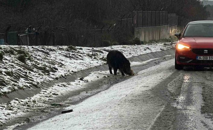 İstanbul’da etkili olan soğuk hava ve aralıklarla görülen kar yağışı, yaban hayatını da olumsuz etkiledi. Yiyecek bulmakta zorlandığı değerlendirilen yabani bir domuz, Hasdal-Kemerburgaz yoluna indi. Yol kenarında bir süre yiyecek yiyen domuz, vatandaşların dikkatini çekti. O anlar, yoldan geçen bazı sürücüler tarafından cep telefonu kamerasıyla kaydedildi. Bir süre yol kenarında kalan domuz, bir süre sonra ormanlık alana girerek gözden kayboldu.