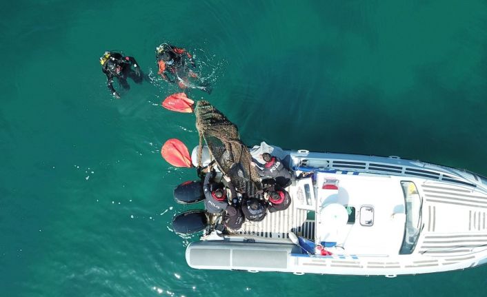 Yeni olduğu belirlenen trol ve algarna düzenekleri, 4 saat süren çalışma sonunda EGESÜF Gemisi’ne çekildi.