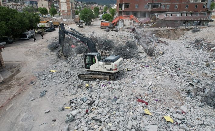 Kahramanmaraş’ta ağır hasarlı yapıların yıkımı ve enkazının kaldırma çalışmaları hızla devam ederken, ekiplerin çalışmaları dron ile havadan görüntülendi.
