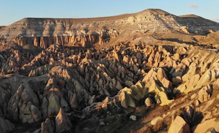 Türkiye’nin dört bir yanından Kapadokya bölgesinde günbatımını izlemek için gelen yerli ve yabancı turistler havadan görüntülendi.