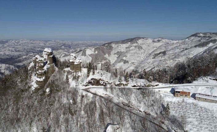 Ordu’nun peribacaları olarak anılan kayalıklar karla ayrı bir güzelliğe büründü.