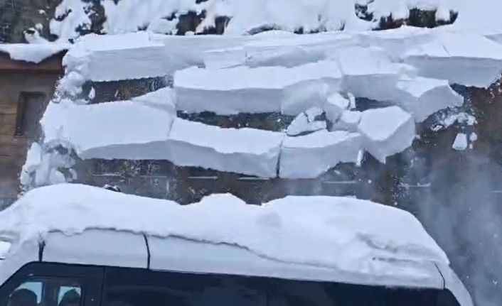Bitlis’te bir binanın çatısında biriken tonlarca ağırlıktaki kar kütlesinin iş makinesinin üzerine düşmesi paniğe neden oldu.