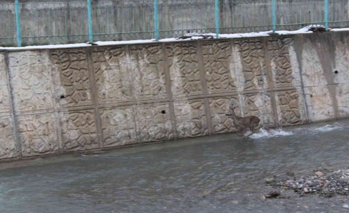 Kastamonu’nun İnebolu ilçesinde yoğun kar yağışında yolunu kaybeden iki karaca, İnebolu çayına girdi. Çayda gezen karacaları gören vatandaşlar, bu anları cep telefonuyla görüntüledi.