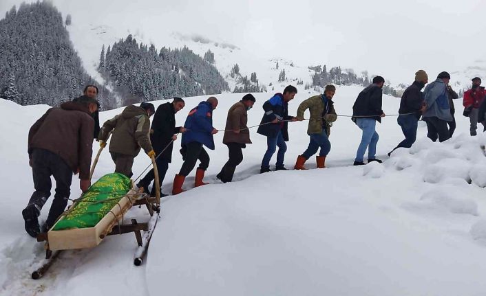 Artvin’in Maden köyünde kar yağışı sonrası cenazeler, köy mezarlığına defnedilmek için 2 kilometrelik mesafeye kızaklarla taşınıyor.