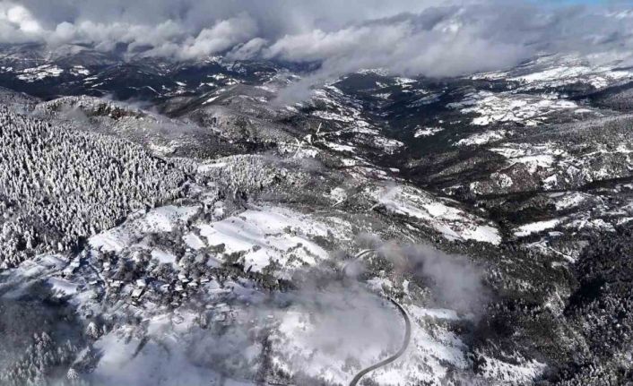 Kar yağışının ardından beyaz örtüyle kaplanan doğa yer yer yoğun sisle birlikte ortaya kartpostallık görüntüler çıkardı. O anlar dron ile görüntülendi.