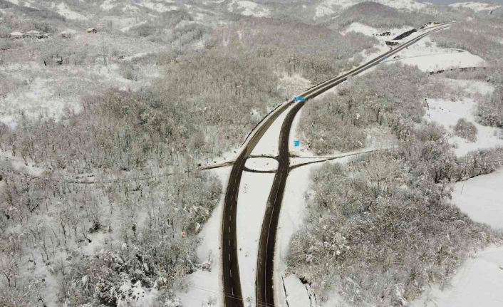 Karadeniz sahil yolunu çevreleyen ormanlarda kar yağışı ile birlikte oluşan manzaralar drone ile görüntülendi.
