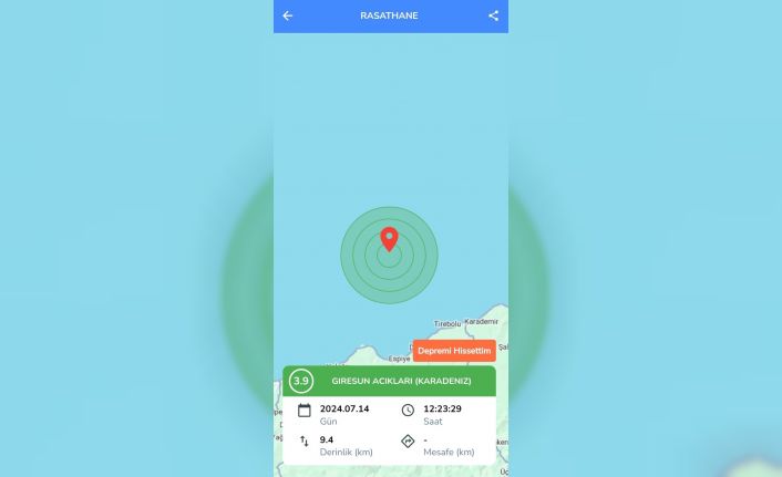 Kandilli Rasathanesi, saat 12.23’te Karadeniz açıklarında 3.9 büyüklüğünde bir deprem meydana geldiğini duyurdu. Merkez üssü Giresun açıklarında 9.4 kilometre derinlikte meydana gelen depremin büyüklüğünün 3.9 olduğu belirtildi.