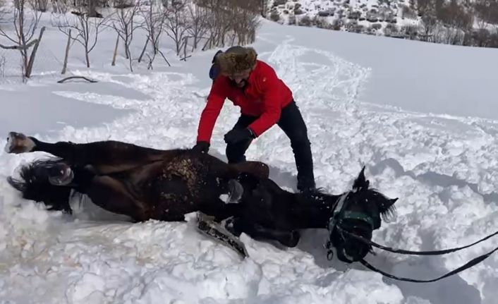 Tokat’ta ahırdan çıkartıldığında kara yatarak yuvarlanan ‘karayel’ isimli atın kar sevinci objektiflere yansıdı.