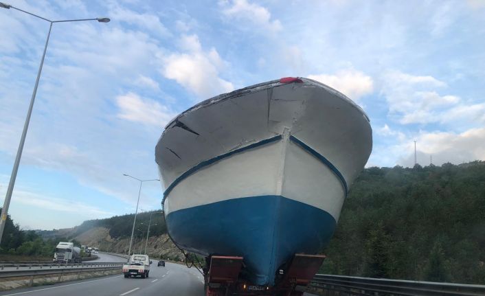 Samsun-Ankara karayolunda bir tırın üzerinde taşınan 21 metre uzunluğunda, 6 metre enindeki balıkçı teknesini görenler şaşkınlığını gizleyemedi.