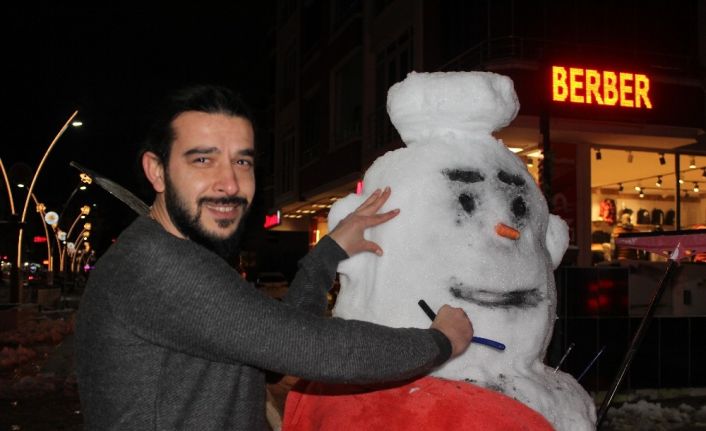Tüm Türkiye’de kar yağışı etkili oluyor. 15 yıldır berberlik yapan Rıza Başar, müşteri bulamayınca 2,5 metre uzunluğunda kardan adam yaptı. Yapmış olduğu kardan adam mahalleli tarafından büyük ilgi ile karşılanırken fotoğraf çektirmek isteyenler sıra oluşturdu. Sabah yaptıkları kardan adamı ’akşama kadar saçı, sakalı uzadı’ diye tıraş eden berber ilginç görüntüler oluşturdu.