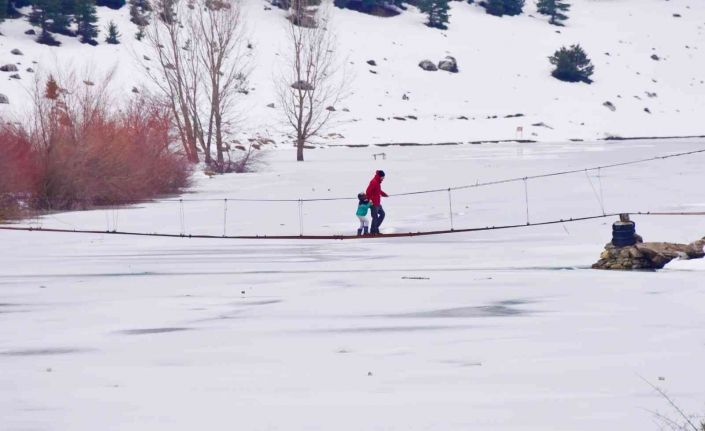 Andırın ilçesine 20 kilometre uzaklıkta bulunan ve Başkonuş Yaylasından, Andırın’a geçerek yüzeyi buzla kaplanan Kargaçayırı Gölü’ne ulaşan doğa tutkunları, eşsiz manzaralarla karşılaştı.