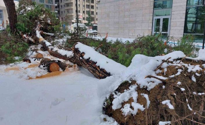 Samsun’da karın ağırlığını taşıyamayan çam ağacı kökünden sökülerek devrildi.