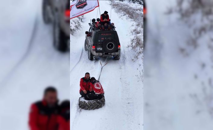 Kastamonu’da kar yağışıyla beyaza bürünen Ilgaz Dağı’na giden doğaseverler, off-road araçlarının arkasına bağladıkları lastikle kayarak eğlendi.