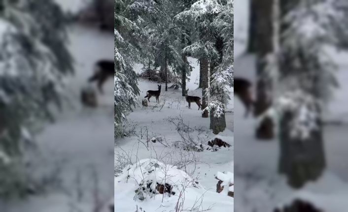 Toprakcuma köyünde karla kaplı orman yolunda aracıyla ilerleyen bir sürücü, 3 karacayı fark etti. Sürücü, cep telefonuyla anne karaca ve 2 yavrusunun karla kaplı ormanda koştuğu anları görüntüledi. Karacalar bir süre sonra gözden kayboldu.