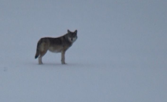 Kars’ta karlı ve soğuk havada aç kalan kurt yerleşim alanına indi.
