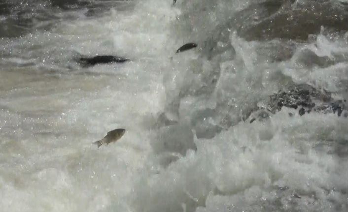 Dereiçi bölgesinde eski hidroelektrik santrali önünde toplanan tatlısu kefalleri, yumurtalarını bırakmak için suyun akışının tersine yüzerek güvenli alanlara çıkmaya çalışıyor. Yolculuk sırasında karşılarına çıkan engelleri zıplayarak aşmaya çalışan tatlı su kefallerinin mücadelesi kameralara yansıdı.