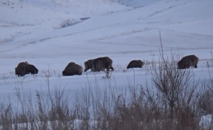 Kars’ta domuz sürüsü ve kurtlar aynı karede