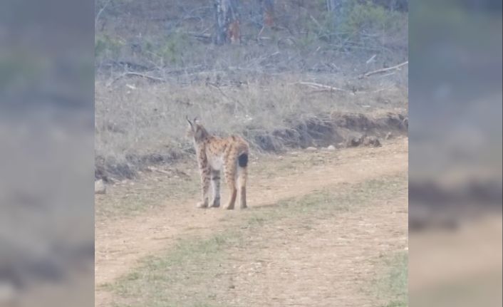 Kastamonu’da, nesli tükenme tehlikesi altındaki vaşak ormanlık alanda dolaşırken görüntülendi.