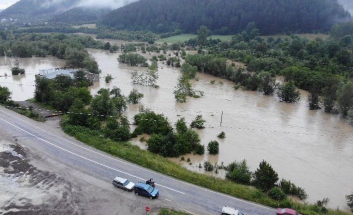 Kastamonu’da dün gece başlayan şiddetli yağmur, sabah saatlerinde etkisini arttırdı. Şiddetli yağışlardan etkilenen ilçelerden olan Azdavay’da sel suları altında kalan Yeni Mahalle, pazar yeri, Ümit Burnu-Çevlik ile Çatak Köprüsü havadan dron ile görüntülendi. Öte yandan Devrekani Çayı’nın taşması sonucu çok sayıda ev ve işyeri sular altında kaldı. Derenin taştığı ilçede tarım arazileri de zarar gördü. Azdavay Kaymakamlığı Köylere Hizmet Götürme Birliği ve Azdavay Belediyesi, iş makinaları ile dereden gelen tomruklar ve ağaç köklerini çekerek köprünün yıkılmasını engelledi. Ekipler ilçede hasar gören bölgelerde çalışmalarını hız kesmeden sürdürüyor.