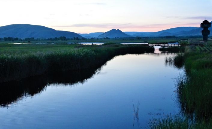 Tokat’ta Kaz gölünde gün batımında havadan görüntülenirken, gökyüzündeki kızıllık doğa harikası manzaralar oluşturdu.