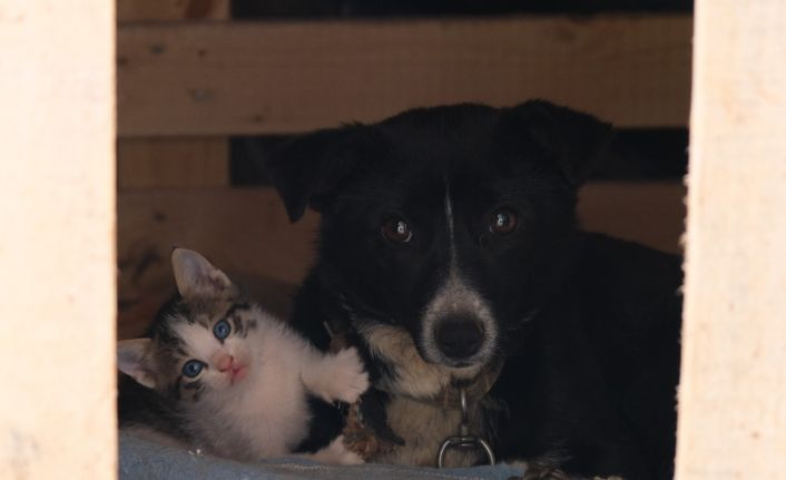 Manisa’da bir köpek, kulübesinde doğum yapan bir kedinin yavrularına bakıcılık yapıyor. Yavru kedilerin yanına kimseleri yanaştırmayan ve onları sahiplenen köpeğin bu davranışı yürekleri ısıttı.