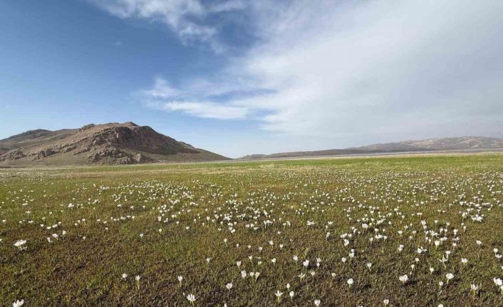 Van’ın Erek Dağı eteklerindeki 2 bin 550 rakımlı Keşiş (Turna) Gölü’nün çevresinde açan kardelenlerin oluşturduğu manzara göz kamaştırıyor.