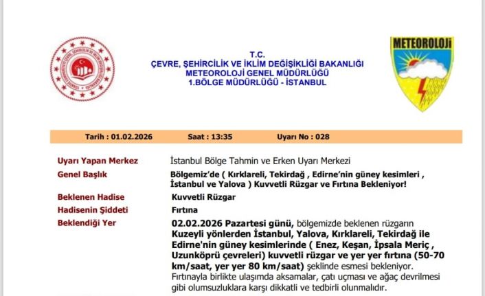 Meteoroloji Genel Müdürlüğü, Marmara Bölgesi’nin batısı için kuvvetli rüzgar ve fırtına uyarısında bulundu. Yapılan son değerlendirmelere göre Kırklareli, Tekirdağ, Edirne için kuvvetli rüzgar ve yer yer fırtına bekleniyor. 2 Şubat Pazartesi günü saat 00.00’dan itibaren 23.59’a kadar etkili olması beklenen rüzgarın 50-70 km/saat, yer yer 80 km/saat hızla eseceği tahmin ediliyor. Kuvvetli rüzgar ve fırtınayla birlikte çatı uçması, ağaç ve direk devrilmesi ile ulaşımda aksamalar gibi olumsuzluklara karşı vatandaşların dikkatli ve tedbirli olması istendi.