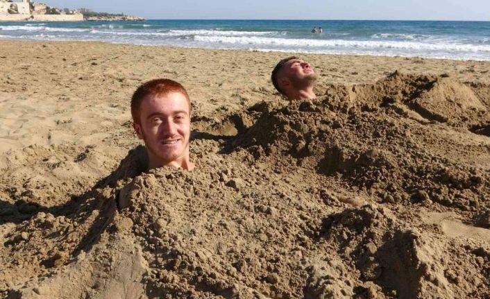 Yarıyıl tatili için Sivas’tan Mersin’e geldiğini belirten Metin Durmuş, "Sivas’ın Gemerek ilçesinden geldik. Bizim oralar kar kış, tipi boran. Buraya geldik cennet. Güneşi gördük, deniz ve hava sıcak. Denize girelim dedik. Baktık hava sıcak yaz gibi geldi buralar. Denize girelim, kuma gömülelim dedik. 20 dereceler de hava" diye konuştu.