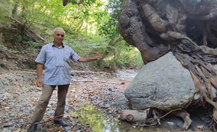 Bartın’ın Ulus ilçesindeki dere yatağında bulunan ve 300 yıllık olduğu tahmin edilen bir çınar ağacı, kökleriyle yaklaşık 2 ton ağırlığındaki kayayı askıda tutuyor. Sel sonrası ortaya çıkan ilginç görüntü, görenleri hayrete düşürüyor.