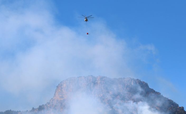 Gece boyu ekiplerin karadan müdahalesi sürerken günün ilk ışıklarında yangına söndürme helikopteriyle de müdahale ediliyor.