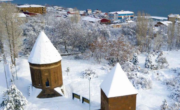 Bitlis’in Ahlat ilçesindeki tarihi kümbetler kar yağışı sonrası seyrine doyumsuz görüntüler oluşturdu.