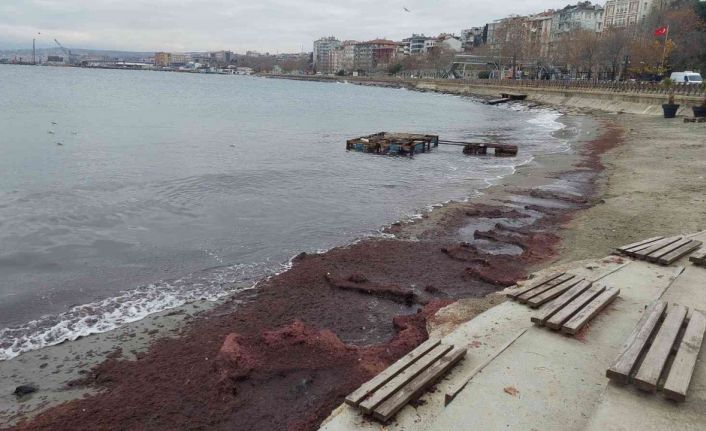 Marmara’da etkili olan lodos, Tekirdağ sahillerine kırmızı yosun getirdi.