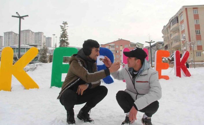 Malatya Kernek Meydanında gençler, karlı pekmezin tadına baktı. Evlerinden pekmez getirip karla karıştırıp yiyen gençler, bir yandan da karın tadını çıkardı.