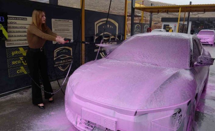 Malatya’da pembe köpükle hizmet veren self oto yıkama servisi, özellikle gençlerin ilgisini çekiyor.